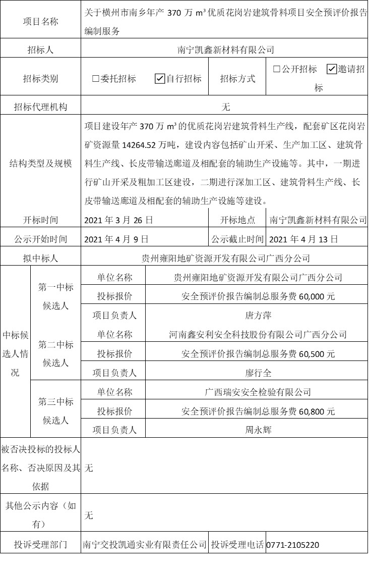 南寧公共交通集團(tuán)有限公司對(duì)友愛充電站配電設(shè)施遷改項(xiàng)目的施工單位進(jìn)行了競爭選聘,評(píng)審工作于2021年4月7日結(jié)束,現(xiàn)將中標(biāo)結(jié)果公示如下:一、項(xiàng)目名稱:友愛車場充電站箱式變壓器配電設(shè)施遷改項(xiàng)目二、中標(biāo)單位:廣西致晟電力科技有限公司三、中標(biāo)單位報(bào)價(jià):人民幣壹拾叁萬零伍拾貳元整(¥130,052.00)。四、招標(biāo)人單位地址:南寧市青秀區(qū)民族大道184號(hào) 聯(lián)系人和電話:覃工 0771-5672034五、公示時(shí)間:2021年4月7日至2021年4月13日...